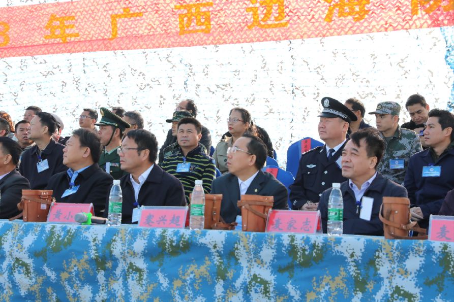 2018年11月23日上午,廣西邊海防軍警民聯(lián)防演練在防城港江山半島白龍珍珠灣海域順利舉行。此次演練由自治區(qū)邊海防委員會(huì)統(tǒng)一領(lǐng)導(dǎo),防城港市邊海防委員會(huì)和自治區(qū)邊海防委員會(huì)辦公室具體承辦,防城港軍分區(qū)、公安邊防、海警、海關(guān)、海事、漁政、海上民兵分隊(duì)和國(guó)家緊急醫(yī)學(xué)救援隊(duì)(廣西海上緊急醫(yī)學(xué)救援中心)等單位參加演練。自治區(qū)邊海防委員會(huì)辦公室主任黃小寧擔(dān)任演練總指揮,防城港市蹇興超副市長(zhǎng)、農(nóng)業(yè)農(nóng)村廳王凱學(xué)副廳長(zhǎng)、衛(wèi)生健康委員會(huì)麥家志副主任及南部戰(zhàn)區(qū)陸軍、自治區(qū)公安廳、外事辦、海洋局、打私辦、南寧海關(guān)、公安邊防總隊(duì)、海警總隊(duì)等有關(guān)單位領(lǐng)導(dǎo)應(yīng)邀觀摩本次演練活動(dòng),廣西華業(yè)投資集團(tuán)董事長(zhǎng)龍其生作為特邀嘉賓在主席臺(tái)就坐并全程觀摩了演練活動(dòng)。