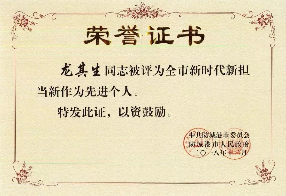 龍其生董事長(zhǎng)榮獲防城港市“新時(shí)代新?lián)?dāng)新作為先進(jìn)個(gè)人”榮譽(yù)稱號(hào)