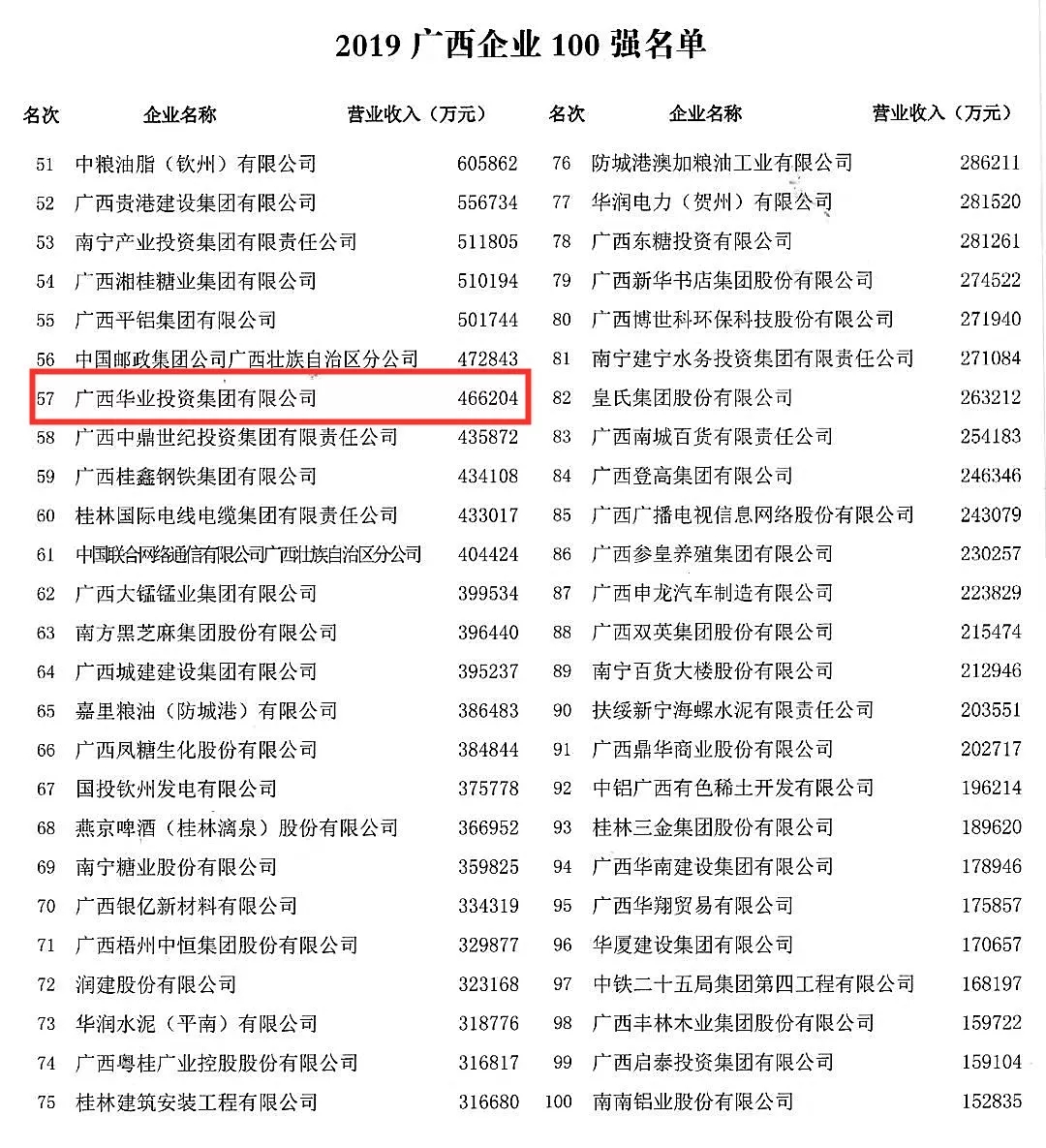 大會發(fā)布了2019年廣西企業(yè)100強(qiáng)等榜單及廣西大企業(yè)發(fā)展主要研究成果。此次評選以2018年企業(yè)營業(yè)收入作為評選標(biāo)準(zhǔn),共有100家實力雄厚的企業(yè)榮登金榜。其中,廣西華業(yè)投資集團(tuán)有限公司,憑借營業(yè)收入46.6億元,位列廣西百強(qiáng)企業(yè)第57位,連續(xù)兩年榮獲“廣西企業(yè)100強(qiáng)”榮譽(yù)稱號!
